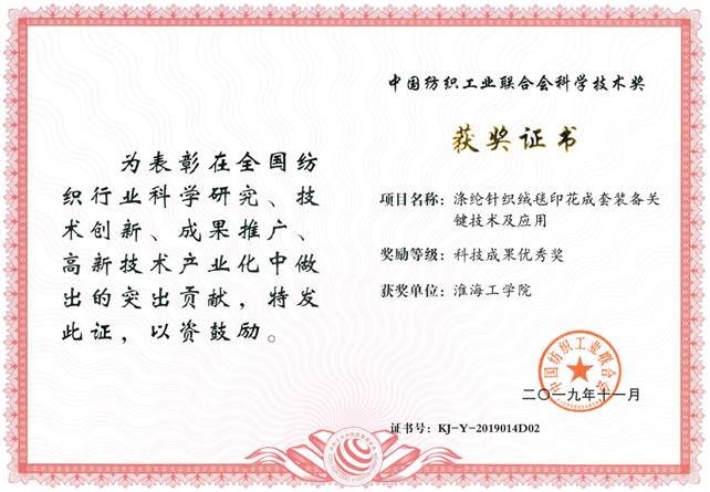 由中国纺织工业联合会主办,纺织之光科技教育基金会协办的“纺织之光”2019年度中国纺织工业联合会科学技术奖日前揭晓。中心陈劲松团队参与申报的科技成果“涤纶针织绒毯印花成套装备关键技术及应用”荣获科技成果优秀奖。该成果创新性地开发了一种全自动干燥固色一体化系统和一套多循环低耗能的水洗系统,提高了固色的稳定性和水洗轧辊的耐疲劳性。项目成果在江苏鹰游纺机有限公司成功应用两年来,取得了较为显著的经济效益和社会效益。