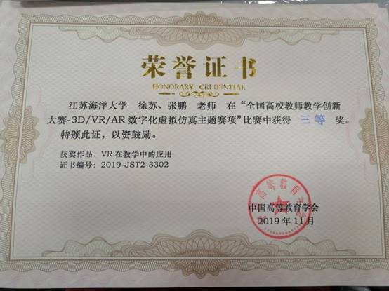 11月1-2日,全国高校教师教学创新大赛3D/VR/AR数字化虚拟仿真主题赛项(简称“3D/VR/AR教师大赛”)总决赛在南京举行。全国159所院校的182参赛团队入围决赛。江苏海洋大学工程训练中心徐苏、张鹏两位老师经过紧张、激烈的角逐,参赛作品“VR在教学中的应用”获得三等奖。