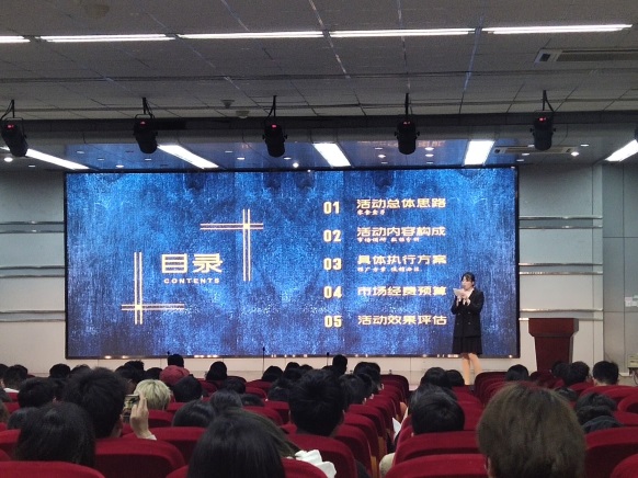 晚会开始,先由主持人介绍了本次大赛的背景、意义、指导老师及决赛团队,随后由各个团队答辩人员依次上台答辩。各团队根据自己的营销策划方案,从产品定位、市场分析、营销方式、推广宣传等几个方面展示了自己的方案与规划。台下,指导老师徐苏对各队答辩表现和内容进行了点拨与评价,并提出了一些自己的建议。与会的三百多名观众也在比赛过程中对各团队的表现进行了投票。